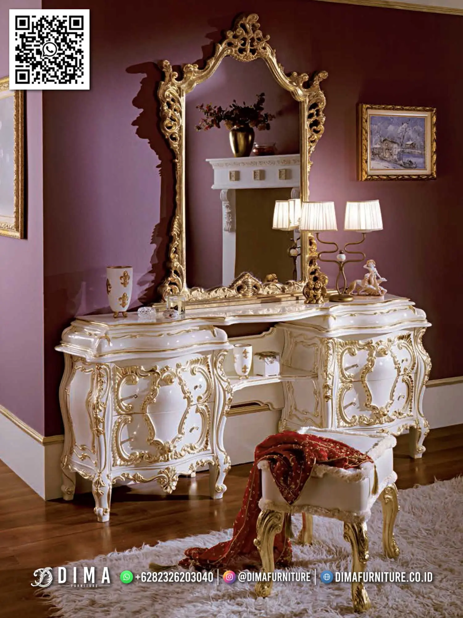 Set meja rias cantik putih gold ukir elegan dima cocok untuk kamar tidur mewah, perpaduan klasik modern dengan detail ukir indah dan cermin besar.