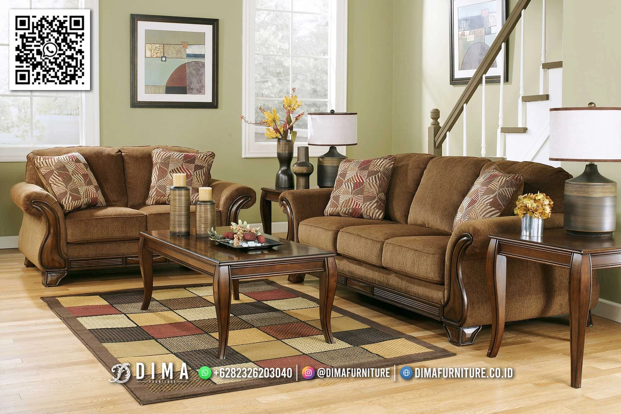 Desainnya mengusung konsep sofa tamu minimalis modern dengan sentuhan klasik ringan pada bagian kaki dan armrest. Finishing natural kayu memberi kesan bersih dan mudah dipadukan dengan berbagai tema interior, mulai dari rumah klasik, modern, sampai konsep ruang tamu elegan yang simpel.