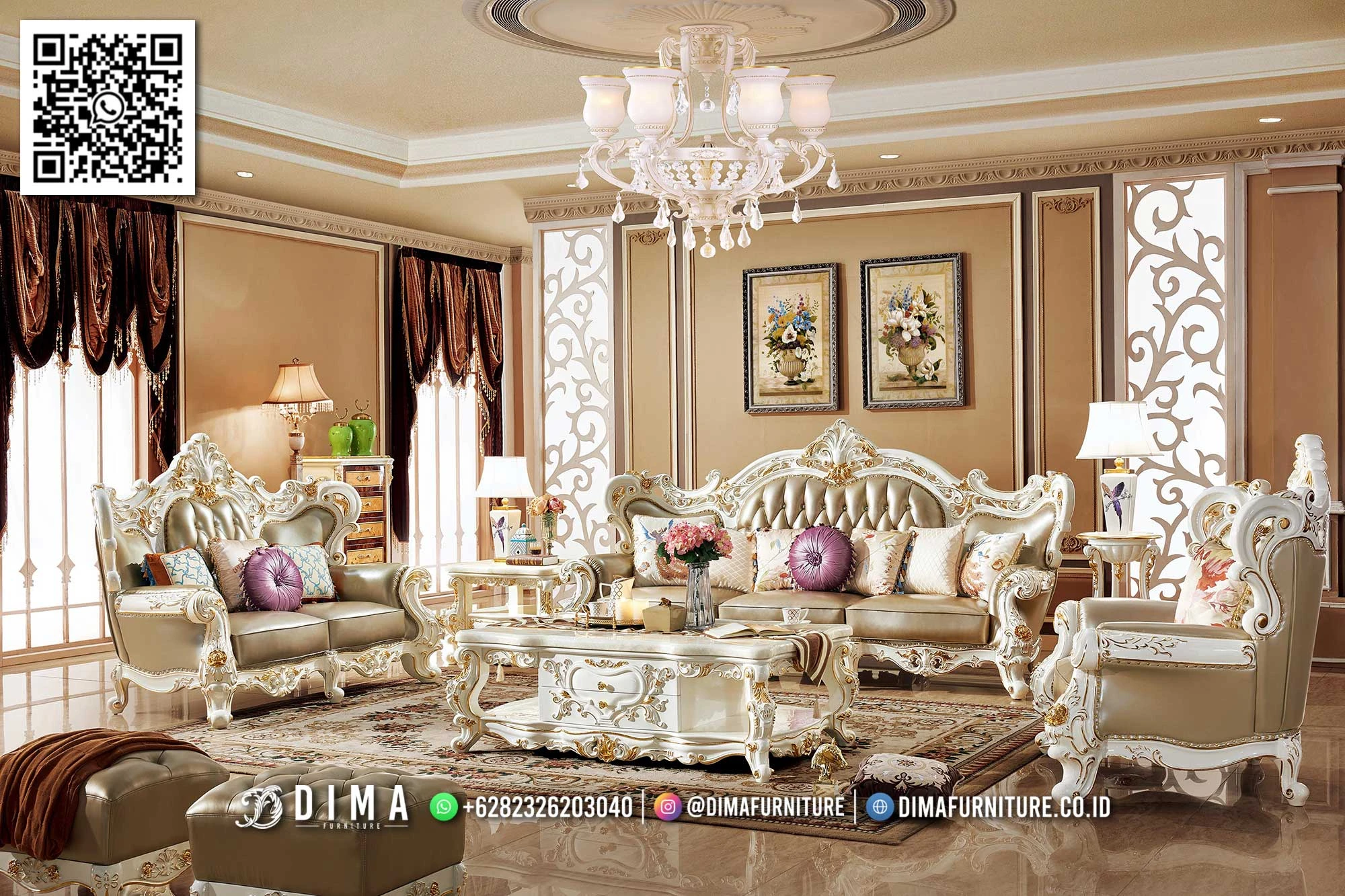 Penekanan pada keyword seperti sofa ruang tamu mewah, furniture klasik elegan, dan sofa luxury gold sangat cocok menggambarkan keunggulan set ini. Tidak hanya tampil mewah, sofa ini juga menawarkan kenyamanan yang terasa dari busanya yang tebal dan tidak mudah kempes.