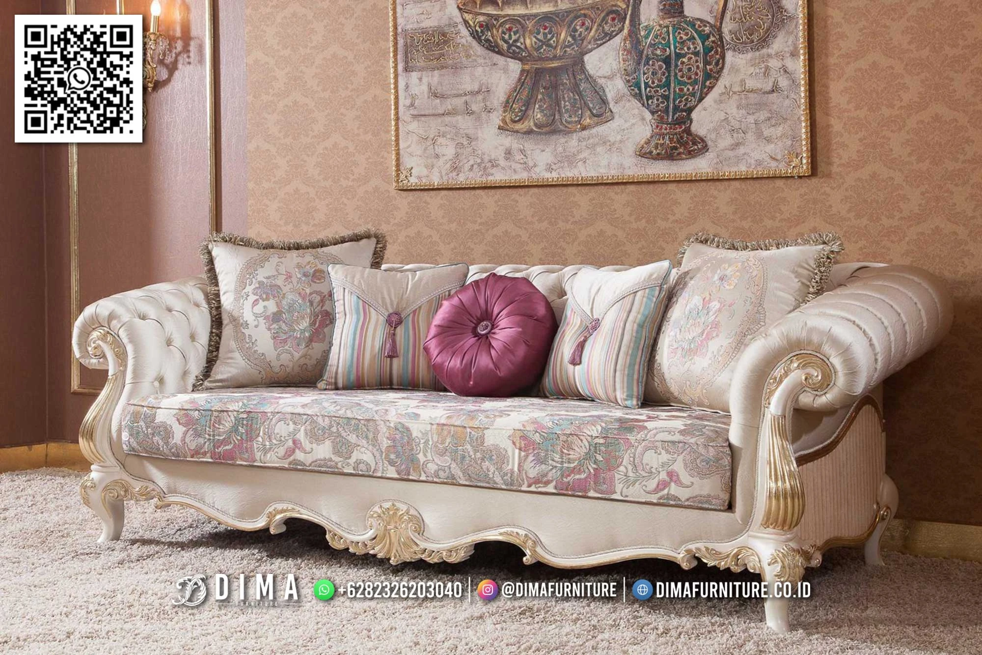 Yang membuat sofa tamu mewah royal estelle menarik adalah perpaduan warna ivory gold dengan motif kain yang lembut.
